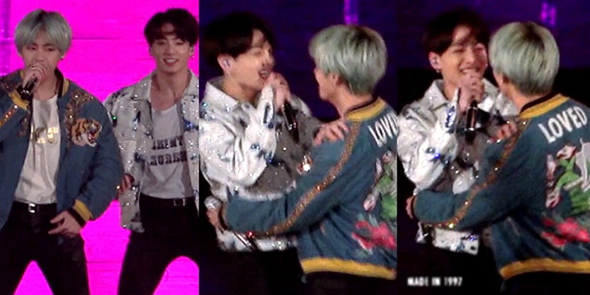 그러자 뷔는 정국의 허리를 감싸 안은 채 자연스럽게 안무를 선보였다. 서로 얼굴을 마주 본 두 사람은 웃음이 터진 듯 수줍게 미소를 지어 보였다.