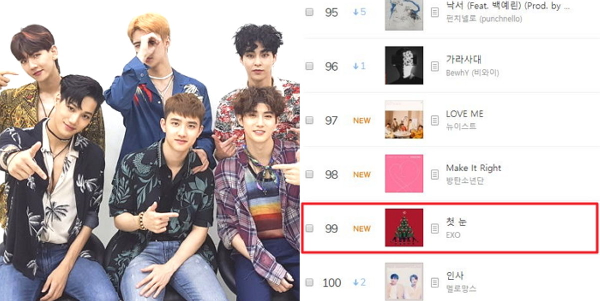 19일 새벽 1시 기준 멜론 실시간 차트에는 엑소의 '첫눈'이 99위에 이름을 올렸다.