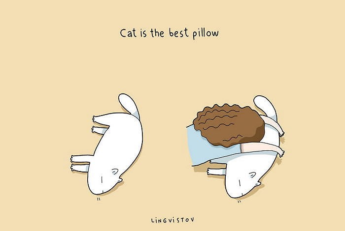 유명 일러스트레이터 '랜디쉬(Landysh)'가 그린 이 그림은 '알람시계', '베개' 등 몸 하나로 다양한 역할을 하는 고양이의 재미난 습성을 집사들이 이해하기 쉽게끔 표현됐다.