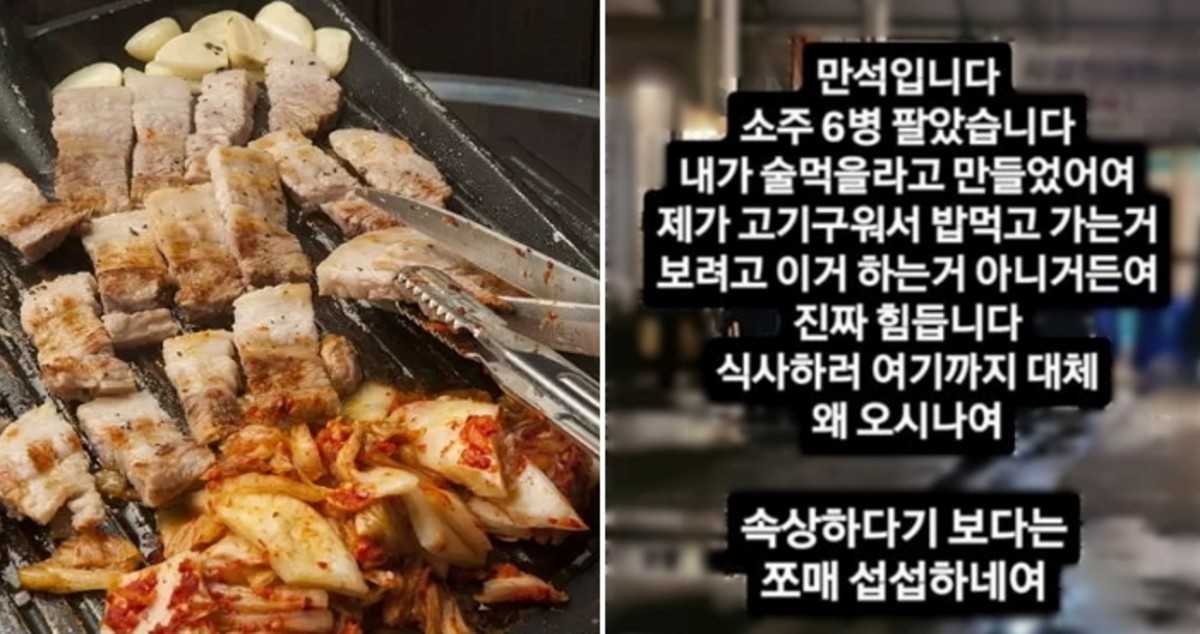 지난 13일 한 온라인 커뮤니티에 울산 남구에서 고깃집을 운영 중인 A씨가 올린 글이 화제가 되었는데요. A씨는 최근 가게가 만석이었음에도 "소주 6병만 팔았다"며 불만을 토로했습니다.