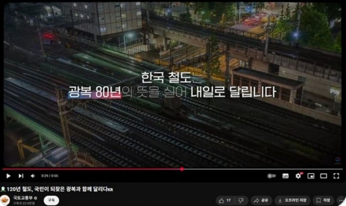 18일 국토부와 온라인 커뮤니티에 따르면, 문제가 된 영상은 지난 15일 광복절에 국토부 공식 유튜브 채널을 통해 공개된 '광복 80년의 뜻을 실어 내일로 달립니다'입니다. 이 1분 56초 분량의 영상은 한국철도의 발전 과정과 성과를 보여주는 다양한 장면들로 구성되어 있었습니다.