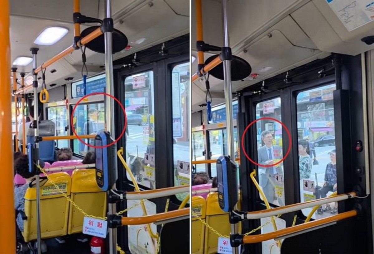게시자 A씨는 전날 부산의 한 버스정류장에서 문 전 대행을 목격했다며 2초 분량의 영상을 공유했습니다. 공개된 영상에는 버스 하차문 유리창 너머로 문 전 대행이 정류장에서 누군가와 대화를 나누는 모습이 담겨 있었는데요.
