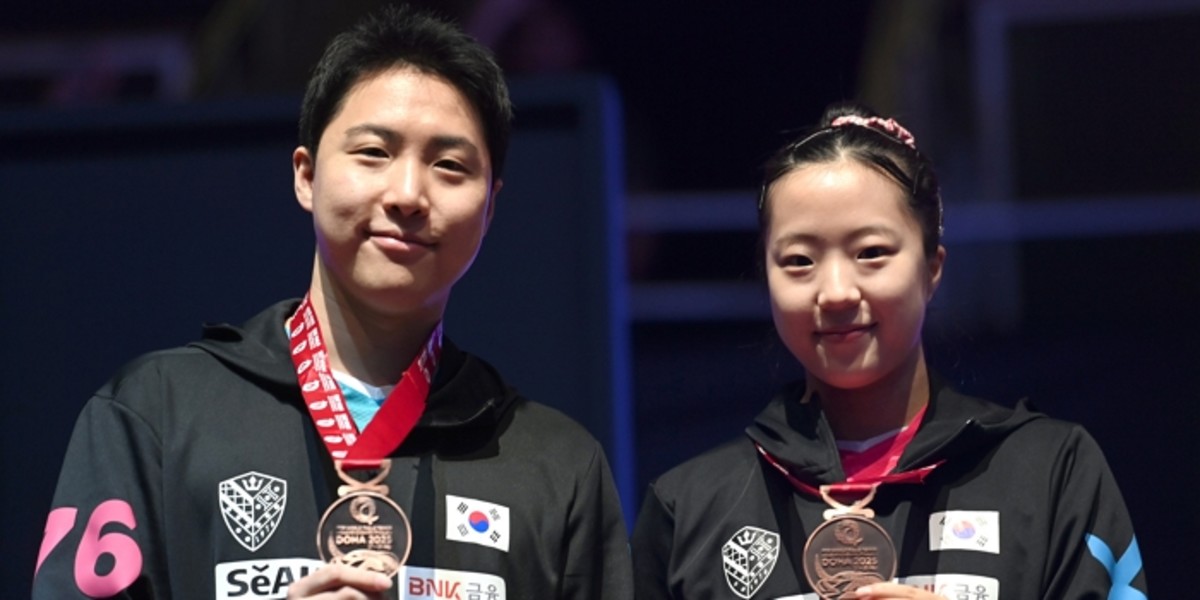 임종훈과 신유빈이 지난 5월 카타르 도하 루사일 아레나에서 열린 2025 국제탁구연맹(ITTF) 세계선수권대회 혼합복식 시상식에서 동메달을 걸고 포즈를 취하고 있다. / 뉴스1