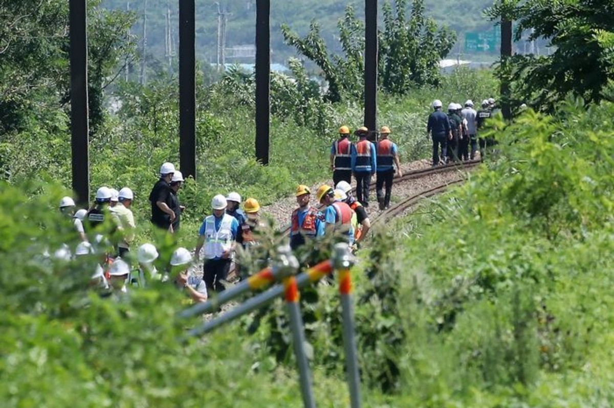 19일 오전 10시 52분쯤 경북 청도군 화양읍 삼신리 청도소싸움 경기장 인근 경부선 철로에서 마산으로 향하던 무궁화 열차가 선로에서 작업하던 근로자 7명을 치는 사고가 발생했다. 경찰과 소방, 코레일 등 관계자들이 사고 현장을 조사하고 있다. 2025.8.19 / 뉴스1