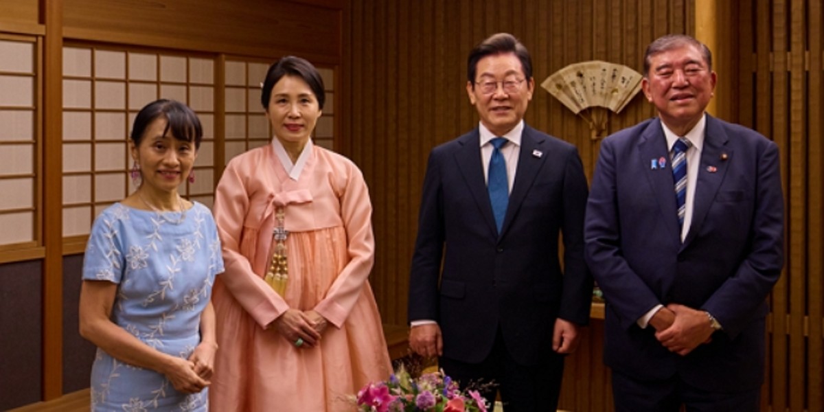 이재명 대통령과 김혜경 여사가 일본 도쿄의 총리 관저에서 이시바 시게루 일본 총리, 이시바 요시코 여사와 기념 촬영을 하고 있다. / 뉴스1