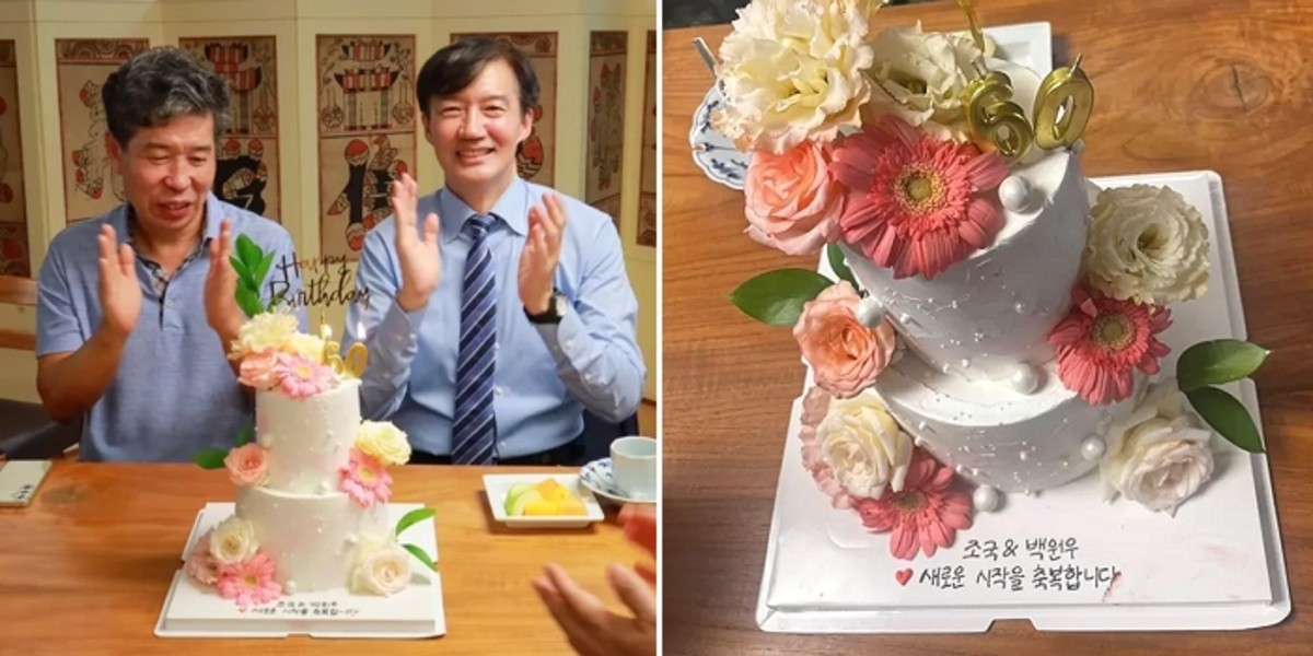 케이크에는 '조국&백원우, 새로운 시작을 축복합니다'라는 의미 깊은 문구가 새겨져 있었는데요.
