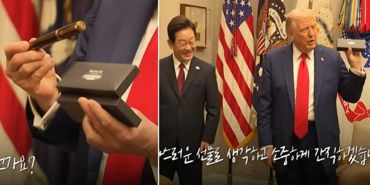 트럼프 대통령은 방명록 서명식 직후 이 대통령이 사용한 펜을 집어 들며 "직접 갖고 온 것이냐"고 물었고, 이 대통령은 "맞다. 갖고 온 것"이라고 답했습니다. 이어 트럼프 대통령은 "어디서 받은 것인가" "두께가 마음에 든다" "정말 멋지다"고 감탄했습니다.