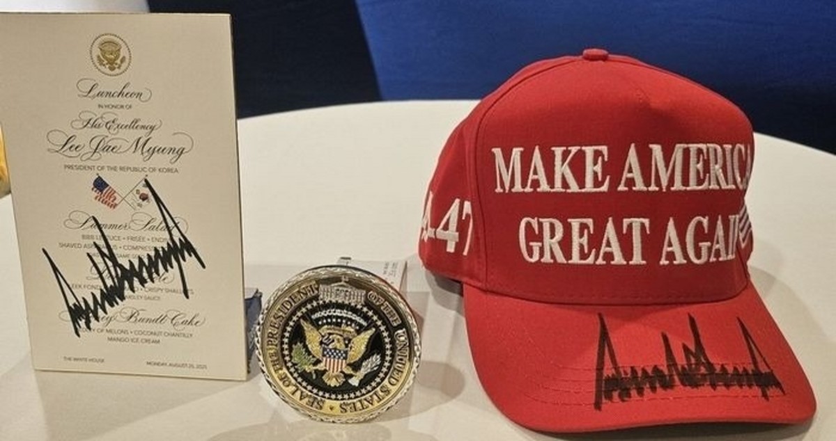 도널드 트럼프 미국 대통령이 25일(현지시간) 이재명 대통령에게 선물한 'MAGA' 모자와 친필 사인 선물들. 2025.8.25 / 뉴스1