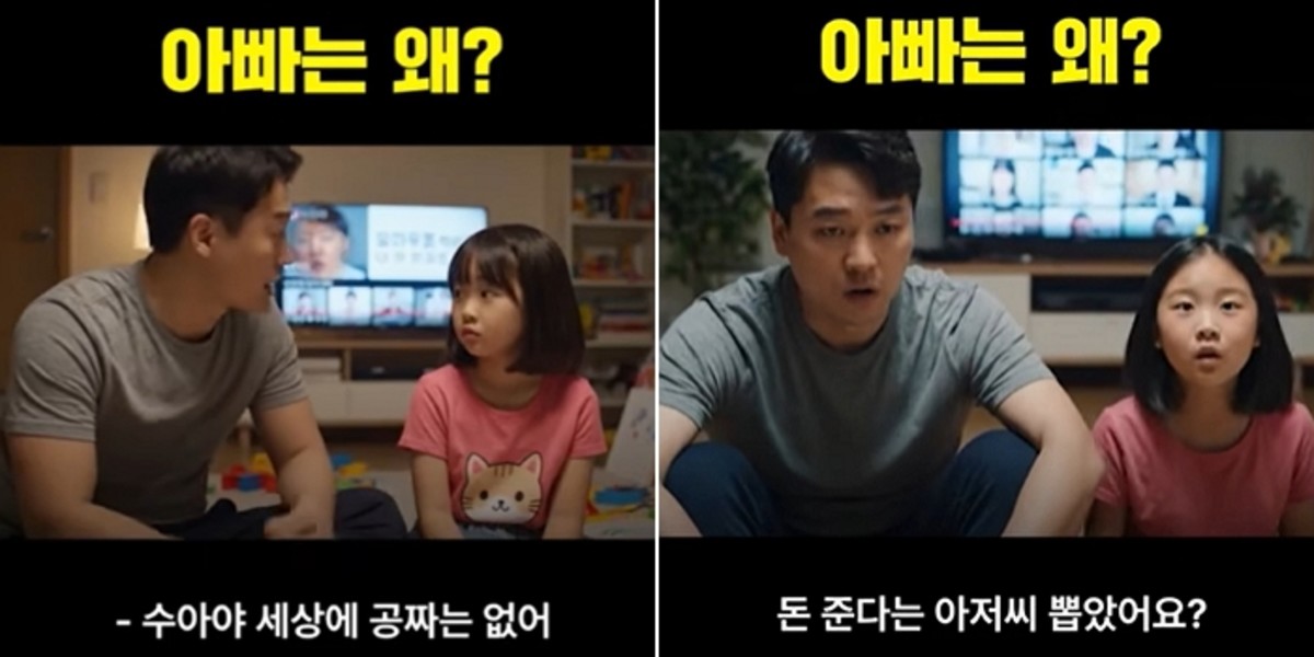 영상 속 아빠는 어린 딸에게 "세상에 공짜는 없다. 모르는 사람이 돈이나 선물을 준다고 해도 절대 따라가선 안 된다"고 단호하게 말합니다. 그러나 딸은 곧바로 "그럼 아빠는 왜 돈 준다는 아저씨를 뽑았어요?"라고 되묻고, 영상은 이 장면에서 끝이 납니다.