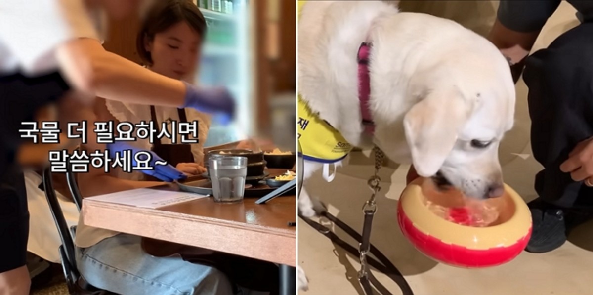 그렇게 주민의 도움을 받아 식당에 들어간 허 씨는 종업원의 세심한 배려를 경험하게 됐는데요. 식당 종업원은 안내견이 편하게 앉을 수 있도록 4인용 테이블을 제공했고, 셀프서비스였던 물과 밥을 모두 가져다주었습니다.