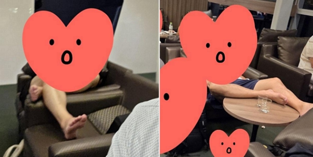 A씨가 공개한 사진에는 귀국을 앞둔 한국인 관광객들이 공항 라운지에 놓인 소파와 식사용 테이블 등에 '맨발'을 올려놓고 누워있는 모습이 담겼습니다.