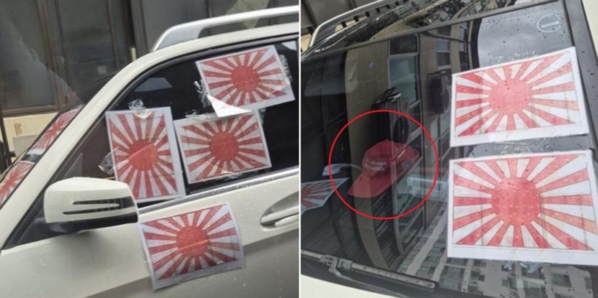 함께 공개된 사진을 보면 흰색 벤츠 GLK 차량의 창문은 물론 차량 내부까지 일본 군국주의를 상징하는 욱일기 이미지가 여러 장 부착되어 있는 모습입니다.