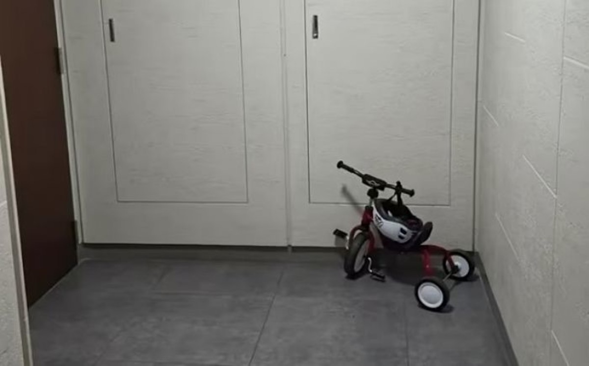 공개된 사진에는 전기·통신 배관 통로 앞에 놓인 어린이용 세발자전거의 모습이 담겼습니다. 작은 자전거에는 헬멧이 걸려있는 모습입니다.
