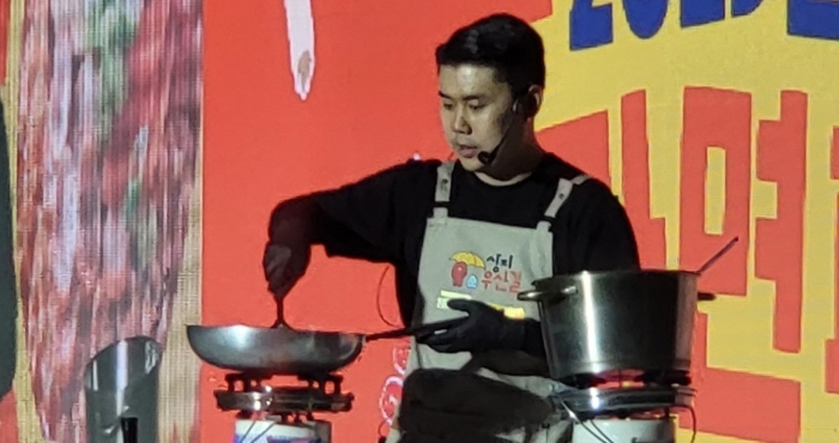 19일 강원 원주시 상지대 노천극장에서 열린 ‘2025 원주라면페스타’ 개막무대에서 ‘나폴리 맛피아’ 권성준 셰프가 쿠킹쇼를 열고 라면을 파인다이닝 감각으로 재해석한 요리를 선보이고 있다. 2025.9.19/뉴스1