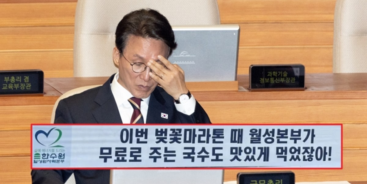김 총리는 "한수원 월성본부가 제작해서 경주 시내 여러 곳에 설치한 현수막이 시민들을 분노하게 만들었다"고 상황을 설명했습니다. 특히 문제가 된 현수막에는 '벚꽃마라톤 때 월성본부가 무료로 주는 국수도 맛있게 먹었잖아!'라는 문구가 포함되어 있었는데요, 김 총리는 이를 "너무 모욕적"이라고 강하게 비판했습니다.