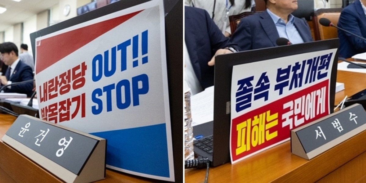 이에 민주당 소속 위원들은 "내란 정당 OUT 발목잡기 STOP"이라는 팻말로 맞대응했습니다.