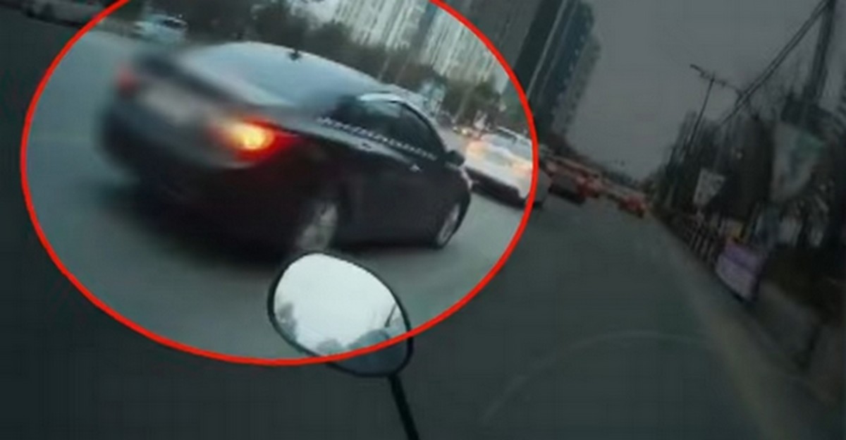무리한 차선 변경 후 책임 회피하는 승용차 운전자, 오토바이 운전자 분노