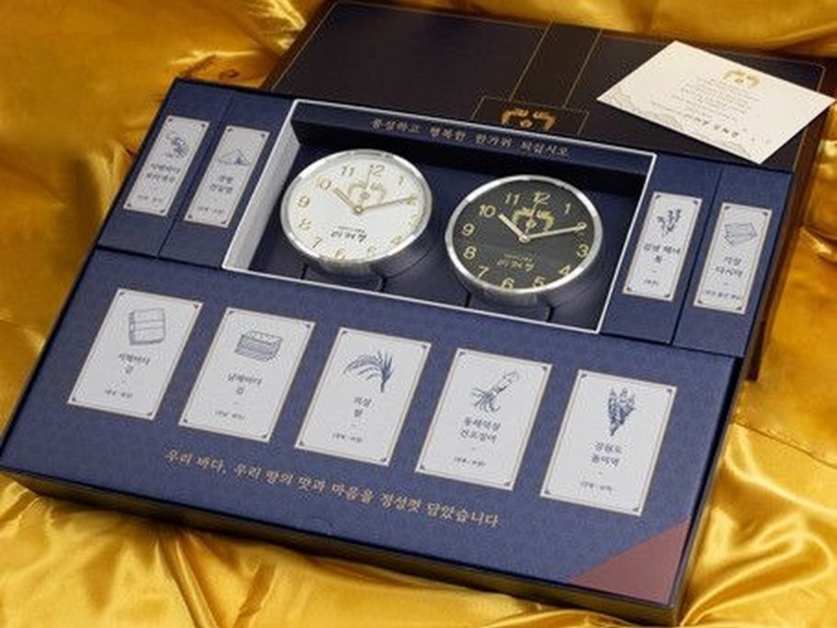 선물 구성은 대통령 서명이 새겨진 탁상시계와 쌀, 그리고 8도 특산 수산물입니다.