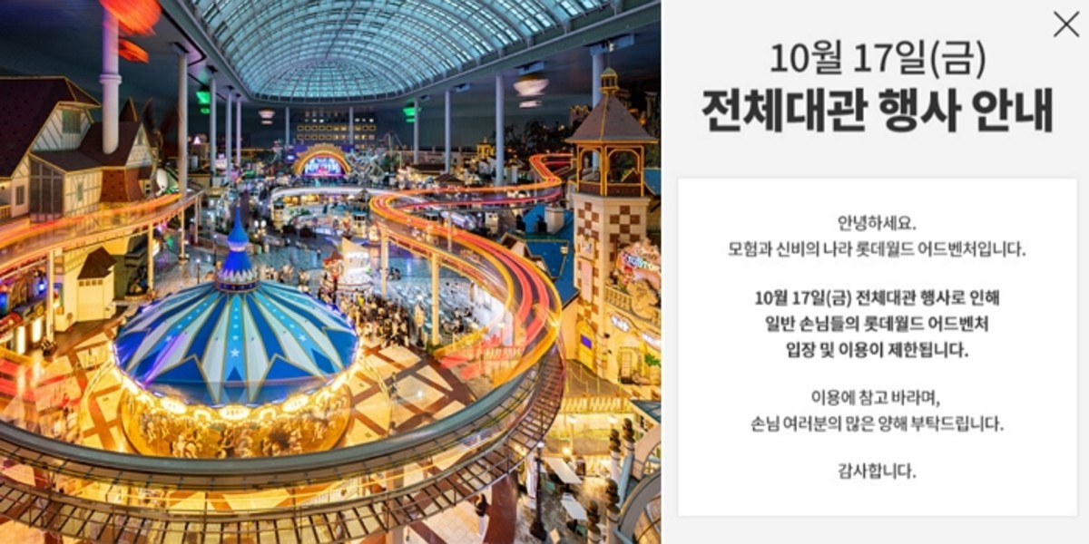 최근 롯데월드는 공식 홈페이지를 통해 10월 17일 전체 대관 행사로 인해 일반 방문객들의 입장 및 시설 이용이 제한된다는 공지를 게시한 바 있습니다. 1989년 개장한 롯데월드가 시설 전체를 특정 기관에 대관하는 것은 지난해 4월 LIG넥스원 패밀리 데이 이후 두 번째 사례입니다.