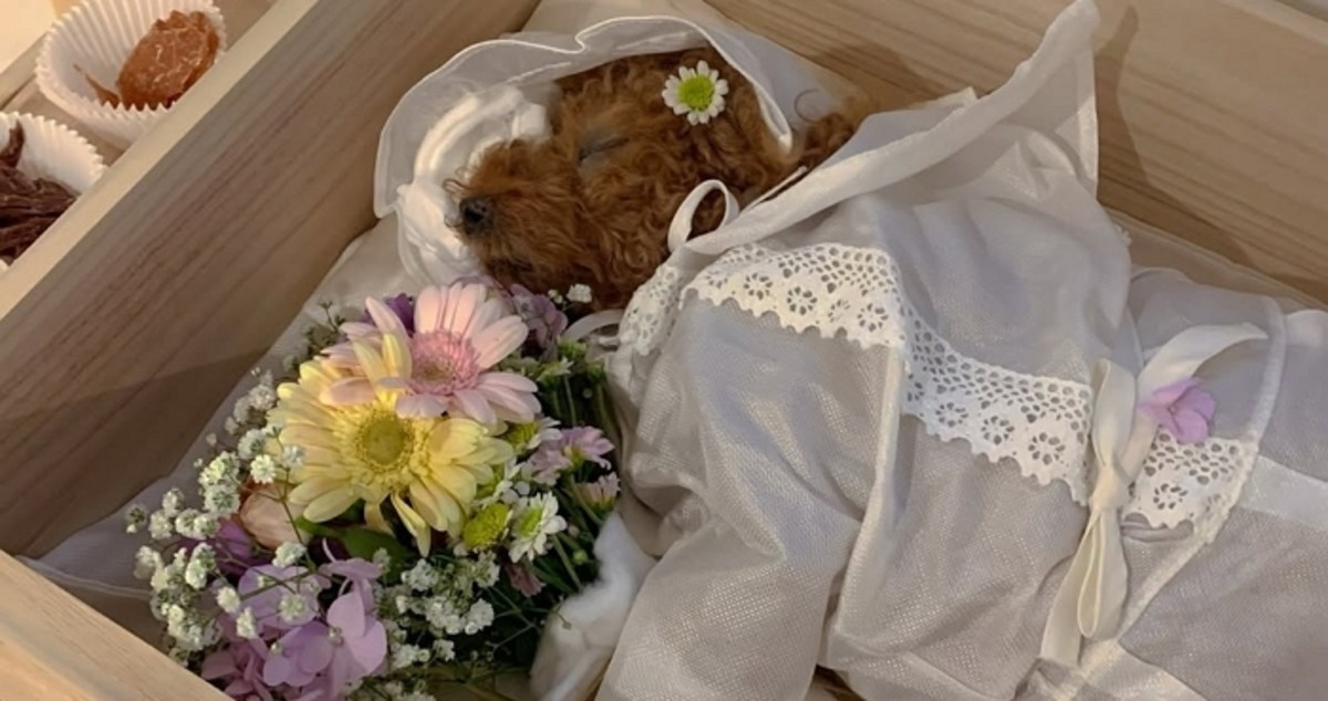 목재 관 속에 안치된 반려견의 머리에는 작은 꽃이 놓여 있었고 주변에는 향기로운 꽃다발과 정성스럽게 준비된 애도 소품들이 자리하고 있었습니다.