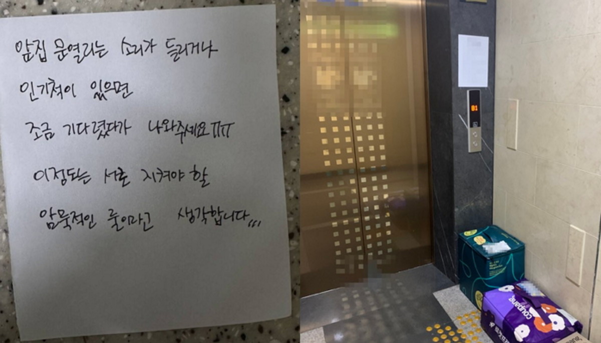 해당 쪽지에는 "앞집 문 열리는 소리가 들리거나 인기척이 있으면 조금 기다렸다가 나와주세요. 이 정도는 서로 지켜야 할 암묵적인 룰이라고 생각합니다"라는 내용이 적혀 있었습니다. 이웃과의 마주침을 피하기 위해 타이밍을 조절해달라는 요청이었던 것입니다.
