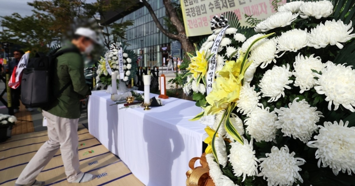 12일 오후 서울 종로구 광화문 김건희 특검 사무실 앞에 김건희 여사 일가의 ‘양평 공흥지구 개발 특혜’ 의혹과 관련해 민중기 특별검사의 조사를 받다 숨진 채 발견된 경기 양평군 공무원 A씨의 분향소가 마련돼 있다. 2025.10.12 / 뉴스1