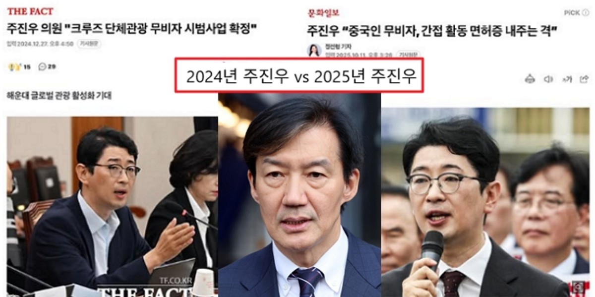 조 위원장이 공유한 2024년과 2025년 기사의 헤드라인은 각각 "주진우 의원 '크루즈 단체관광 무비자 시범사업 확정'"과 "주진우 '중국인 무비자, 간접 활동 면허증 내주는 격'"이었습니다.