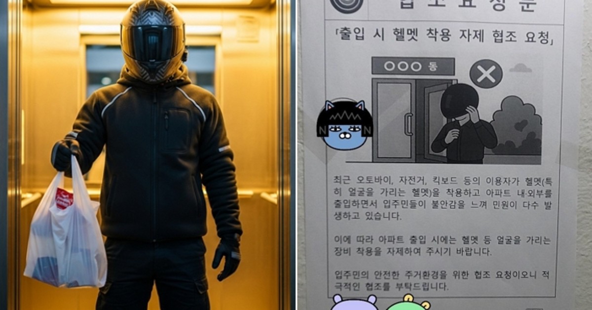 아파트 관리사무소 측은 안내문을 통해 오토바이, 자전거, 킥보드 등의 이용자가 헬멧, 특히 얼굴을 가리는 헬멧을 착용하고 아파트 내외부를 출입할 때 입주민들이 불안감을 느낀다는 민원이 다수 접수됐다고 설명했습니다.