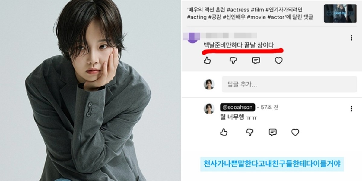 해당 악플은 손수아의 액션 훈련 촬영 영상에 달린 것으로, "백날 준비만 하다 끝날 상이다"라는 내용이었습니다. 이에 대해 손수아는 직접 "너무해"라는 댓글을 달며 속상한 마음을 표현했습니다.