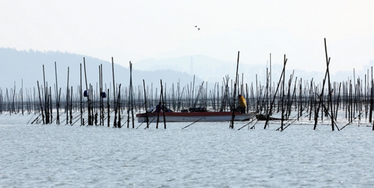 전남 신안군 압해읍 앞바다의 지주식 김양식장에서 추운날씨에도 어민들이 김채취를 하고 있다. / 뉴스1