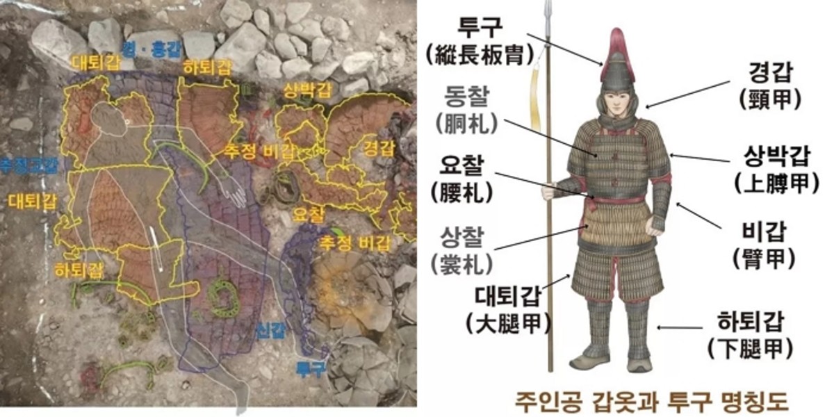 발굴 현장(경주 황남동 1호 목곽묘)에서 출토된 갑옷과 투구 배치 상태 / 경주시
