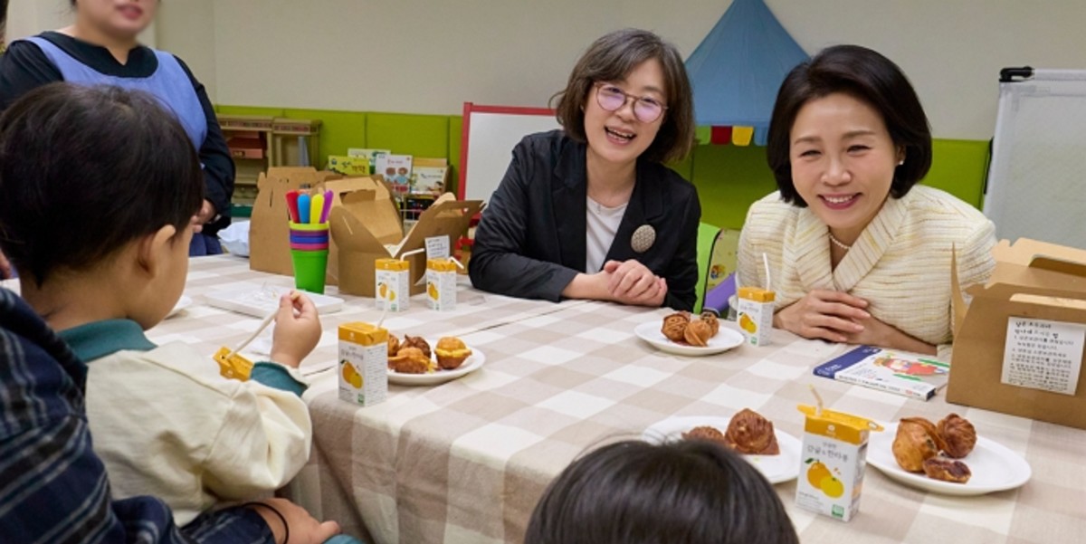 김 여사는 관계자들로부터 시설 운영 현황에 대한 설명을 듣고 한부모가족의 생활 공간을 둘러본 후, 놀이방에서 아이들에게 호두과자와 음료 등 간식을 나눠줬습니다.