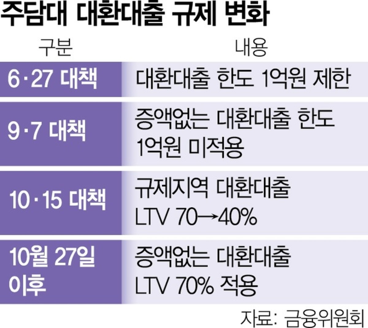 금융위원회는 24일 주택담보대출 갈아타기인 대환대출을 10·15 대책의 LTV 규제 대상에서 제외한다고 발표했습니다. 이에 따라 기존 주택담보대출에 대한 대환대출은 40%가 아닌 70%의 LTV 한도를 적용받게 됩니다. 해당 조치는 이달 27일부터 시행될 예정입니다.
