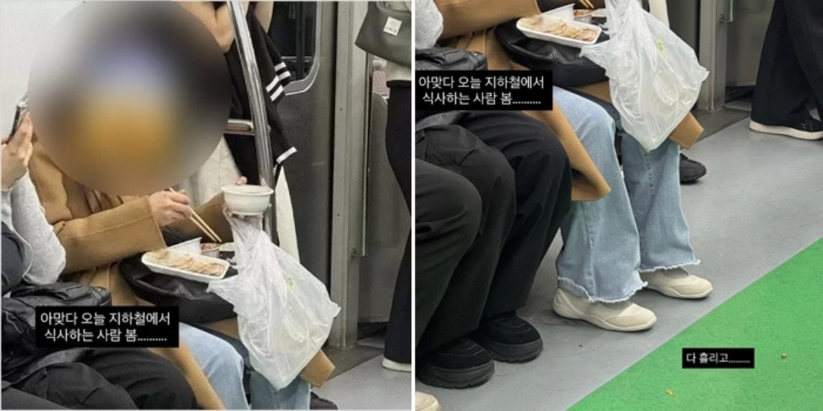 공개된 사진에는 여성이 지하철 좌석에 앉아 무릎 위에 도시락 용기를 놓고 젓가락으로 음식을 섭취하는 모습이 담겨 있습니다.