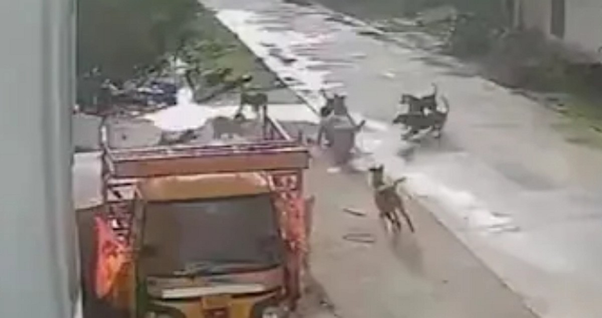 25일(현지시간) 인도 중남부 텔랑가나주 하남콘다의 한 거리에서 7살 소녀가 개떼의 습격을 받는 장면 / 엑스(X)