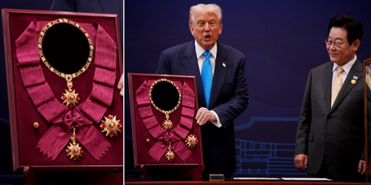 이재명 대통령이 아시아태평양경제협력체(APEC) 정상회의 참석차 국빈 방한한 도널드 트럼프 미국 대통령에게 대한민국 최고 훈장인 '무궁화대훈장'을 선물했습니다.