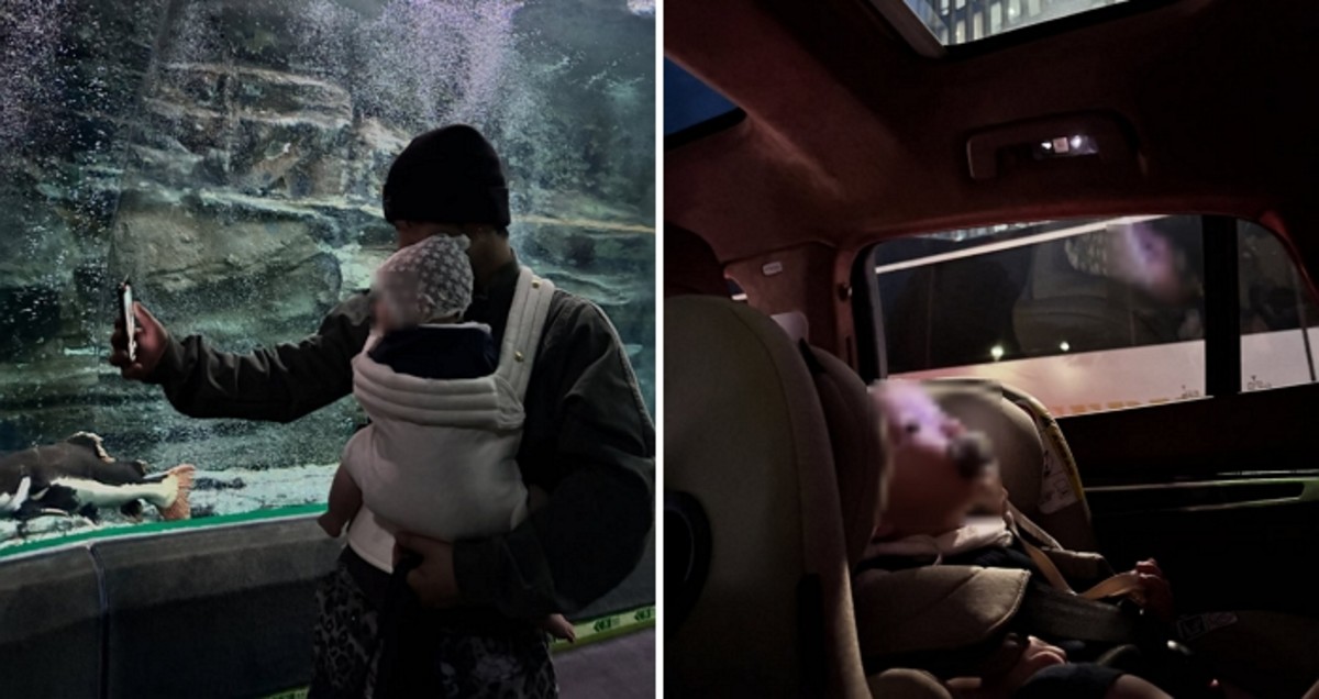 사진에는 카시트에 앉은 루아의 모습과 아쿠아리움에서 아기띠를 착용한 채 딸을 안고 셀카를 촬영하는 양홍원의 모습이 담겼습니다.