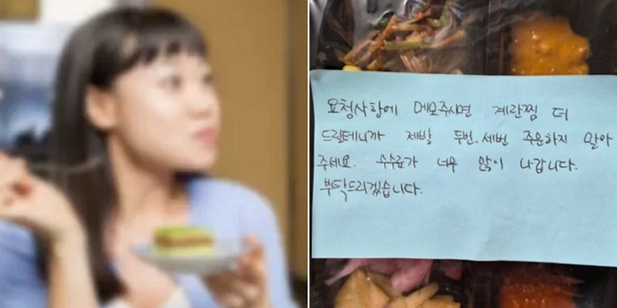 하지만 배달된 음식에는 가게 사장이 보낸 것으로 보이는 쪽지가 부착돼 있었습니다. 해당 쪽지에는 "요청 사항에 메모 주시면 계란찜 더 넣어드릴 테니까 제발 두 번, 세 번 주문하지 말아 주세요"라는 내용과 함께 "수수료가 너무 많이 나간다"는 설명이 적혀 있었습니다.