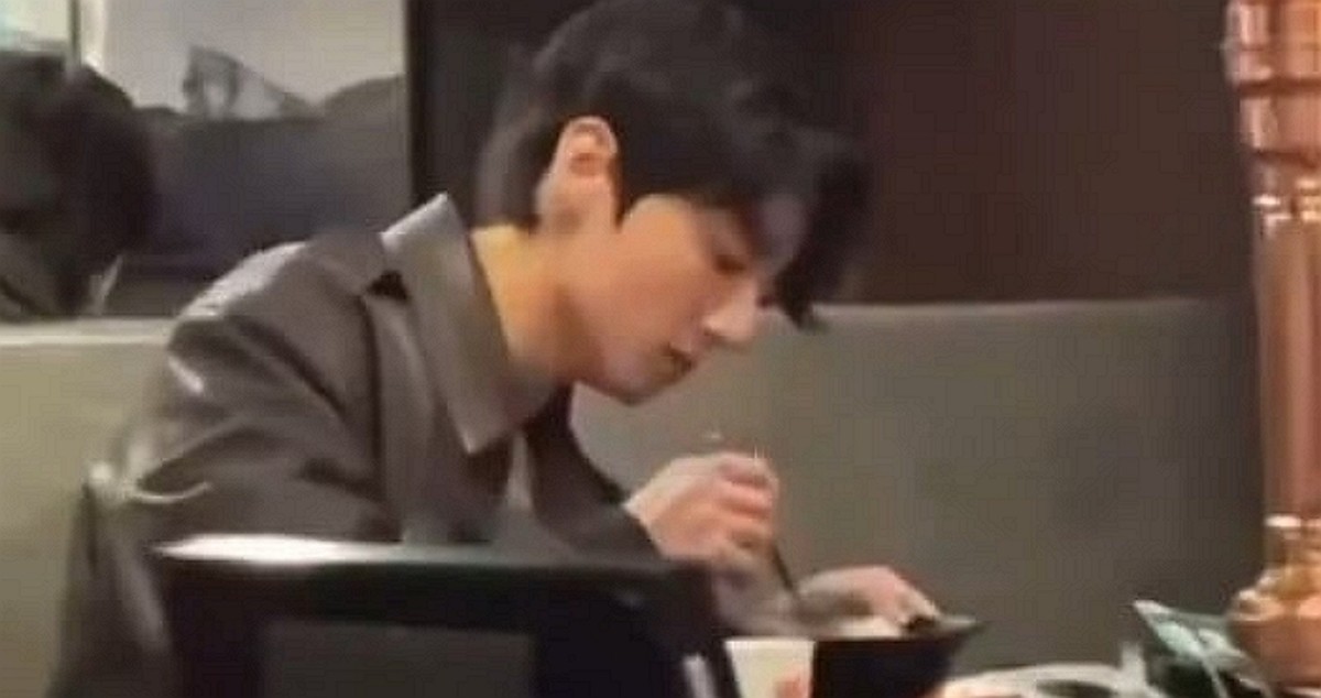 정국이 앉은 테이블에는 다른 사람은 없었으며, 주변 시선을 의식하지 않고 자연스럽게 식사를 즐기는 모습이었습니다.