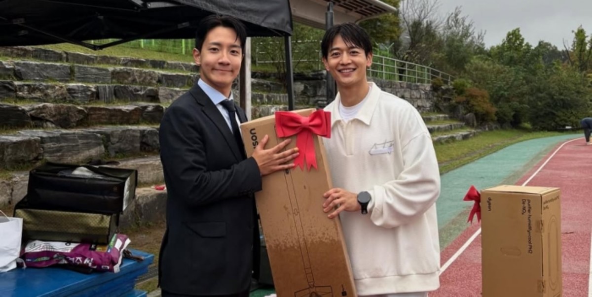 공개된 사진에는 민호가 MBC 예능 프로그램 '나 혼자 산다' 운동회에서 MVP로 선정되어 받은 상품을 고강용 아나운서에게 선물하는 모습이 포착되었습니다.