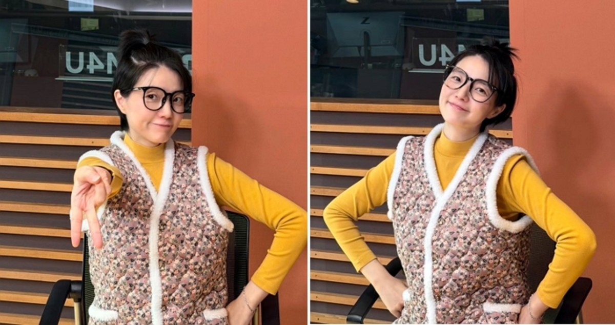 꽃무늬 조끼와 겨자색 폴라티셔츠를 매치하고 큼직한 안경을 착용한 그는 환한 웃음을 지으며 손가락으로 브이 포즈를 취했습니다.