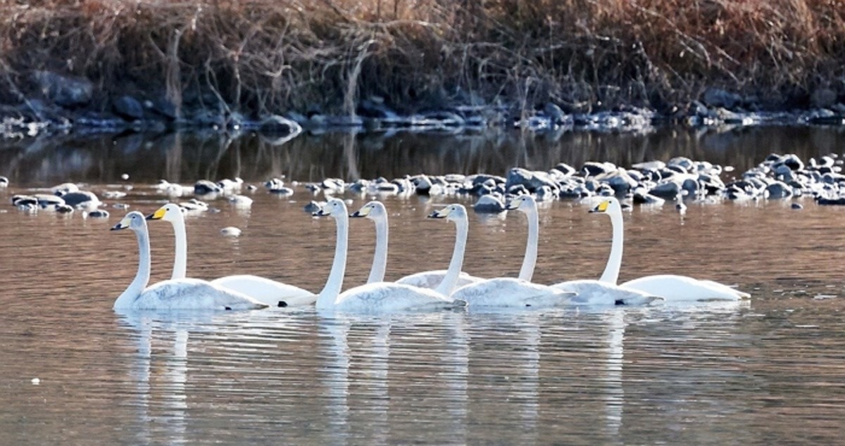 지난 22일 괴산군에 따르면 괴산읍 검승리 달천강 이탄교 인근에서 큰고니 7마리가 관찰됐습니다. 발견된 개체들은 성체와 새끼가 함께 어우러진 가족 단위로 보였습니다.
