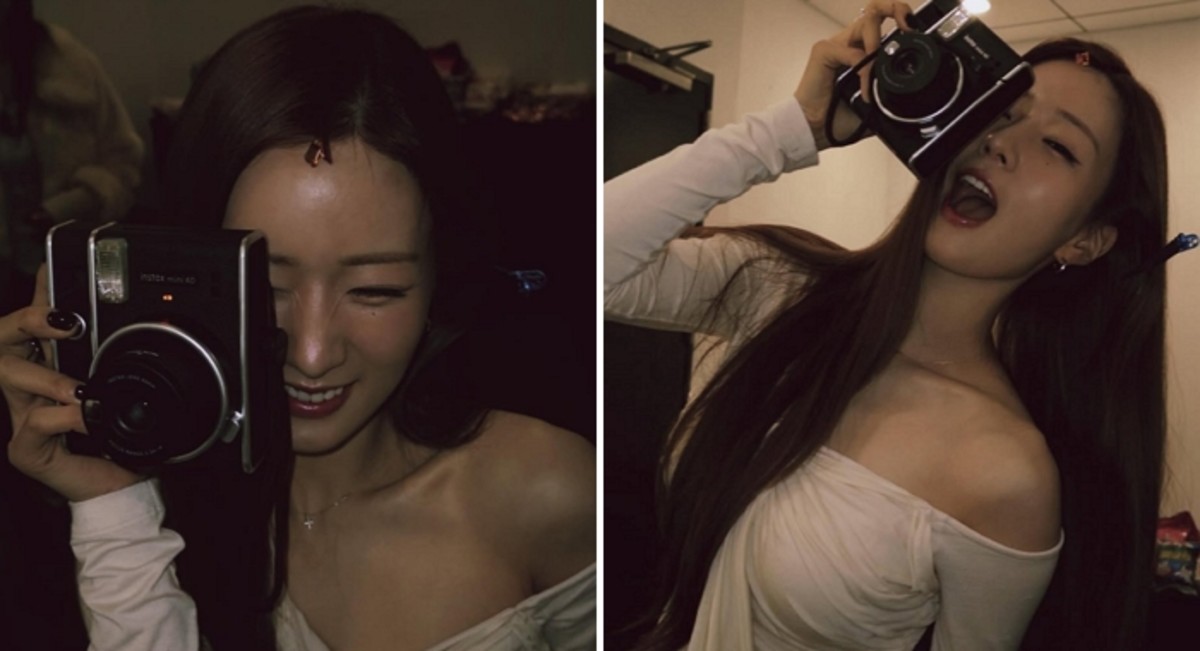 공개된 사진에서 윤보미는 화이트 오프숄더 의상을 착용하고 즉석카메라를 손에 든 모습을 보여줬습니다.