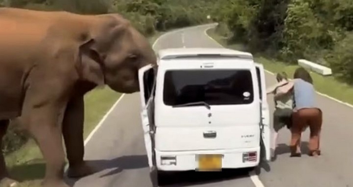 스리랑카에서 3톤 무게의 야생 코끼리가 관광객들이 탄 차량을 공격해 들어 올리는 충격적인 사건이 발생했습니다.