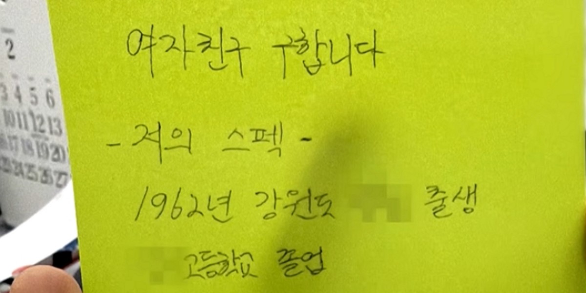 공개된 쪽지에는 '여자친구 구합니다'라는 제목 아래 '저의 스펙'이라며 자신을 소개하는 내용이 담겨 있었습니다. 쪽지 작성자는 1962년 강원도 출생이라고 밝히며 "고등학교 졸업 후 부모님의 농사를 도와 '참나물 재배의 달인' 타이틀을 받았다"고 자신을 소개했습니다.