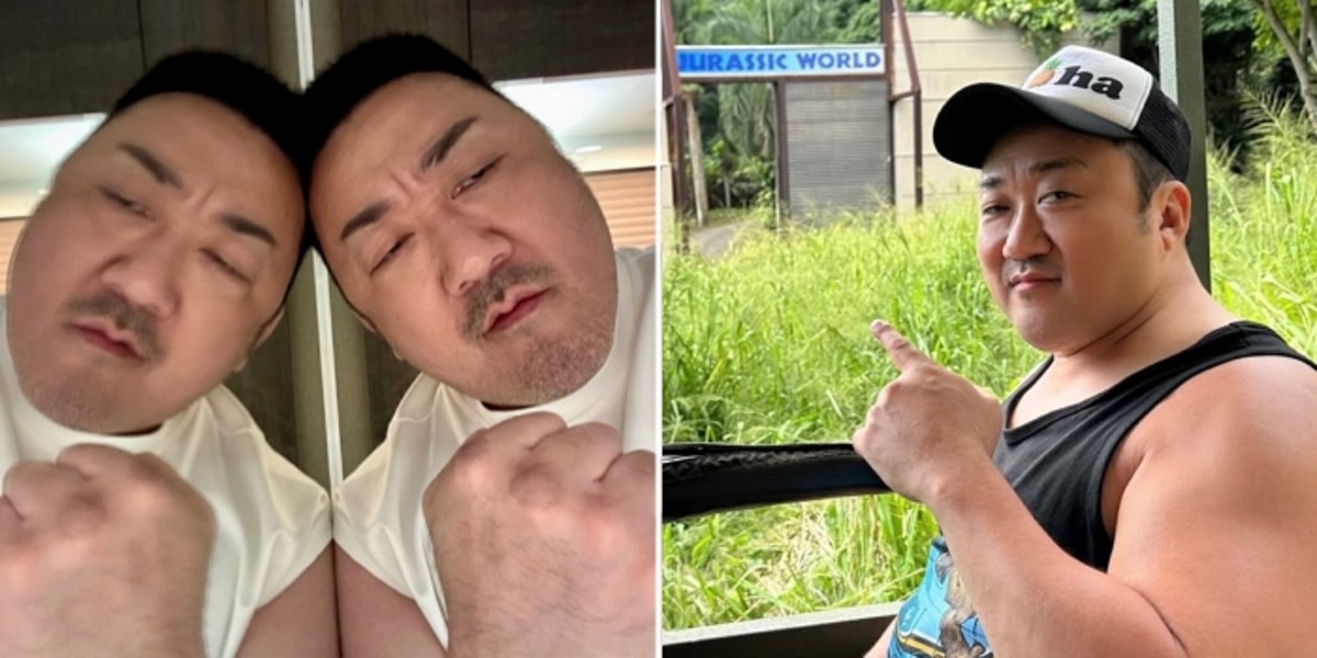 공개된 사진에서 마동석은 '쥬라기 월드' 로고가 눈에 띄는 야외 촬영장을 배경으로 검은색 민소매 티셔츠를 착용한 모습을 선보였습니다.