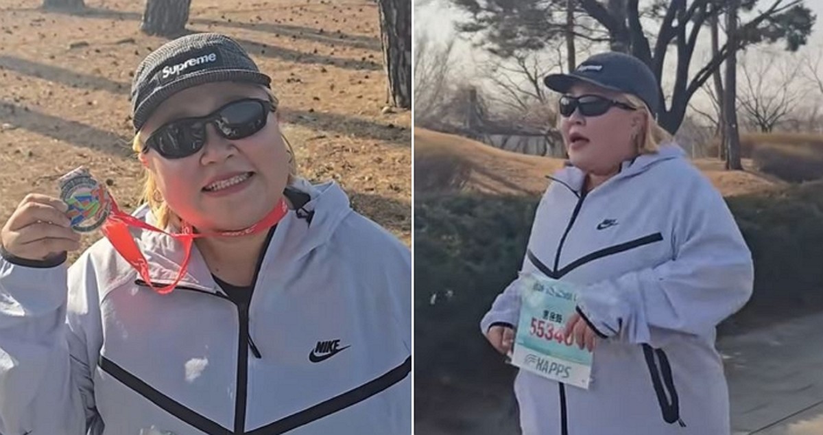 홍윤화는 마라톤 완주에 성공했습니다. 골인지점을 통과한 홍윤화는 많은 환호를 받았습니다.