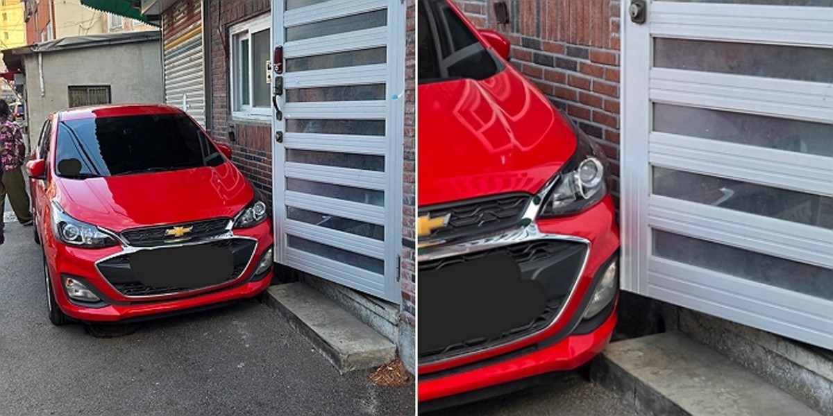 공개된 사진에는 빨간색 쉐보레 차량 한 대가 가정집 측면 현관 바로 앞까지 바짝 붙어 주차된 모습이 담겼습니다.