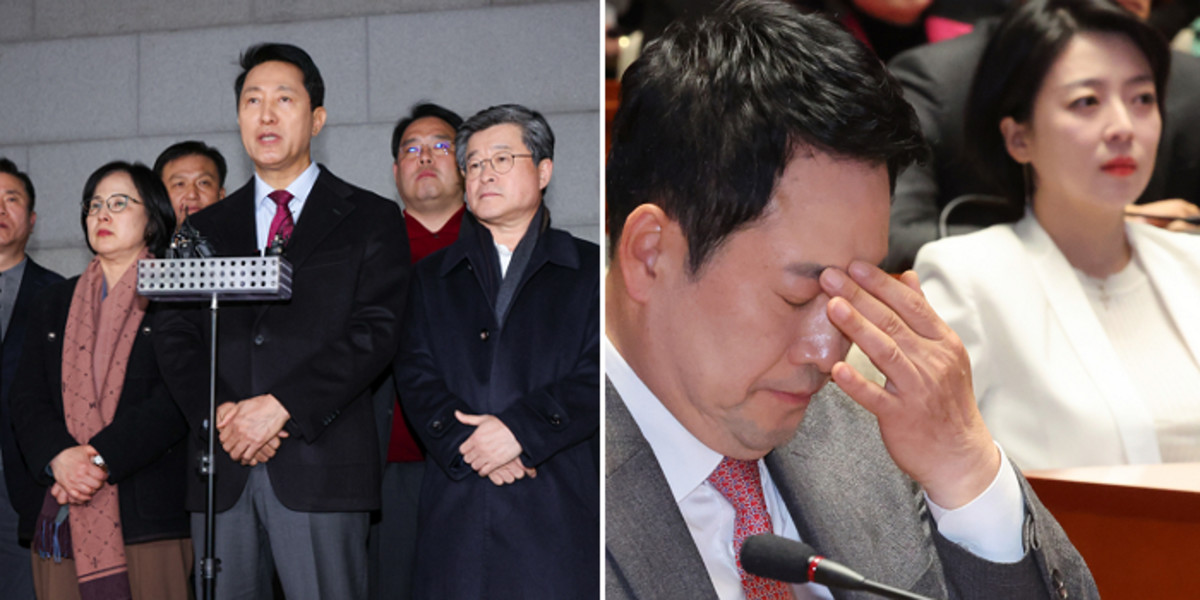 오세훈 서울시장이 9일 저녁 서울 중구의 한 식당 앞에서 국민의힘 소속 구청장 및 시의원들과 당의 결의문 채택에 관한 입장을 발표하고 있다 / 뉴스1